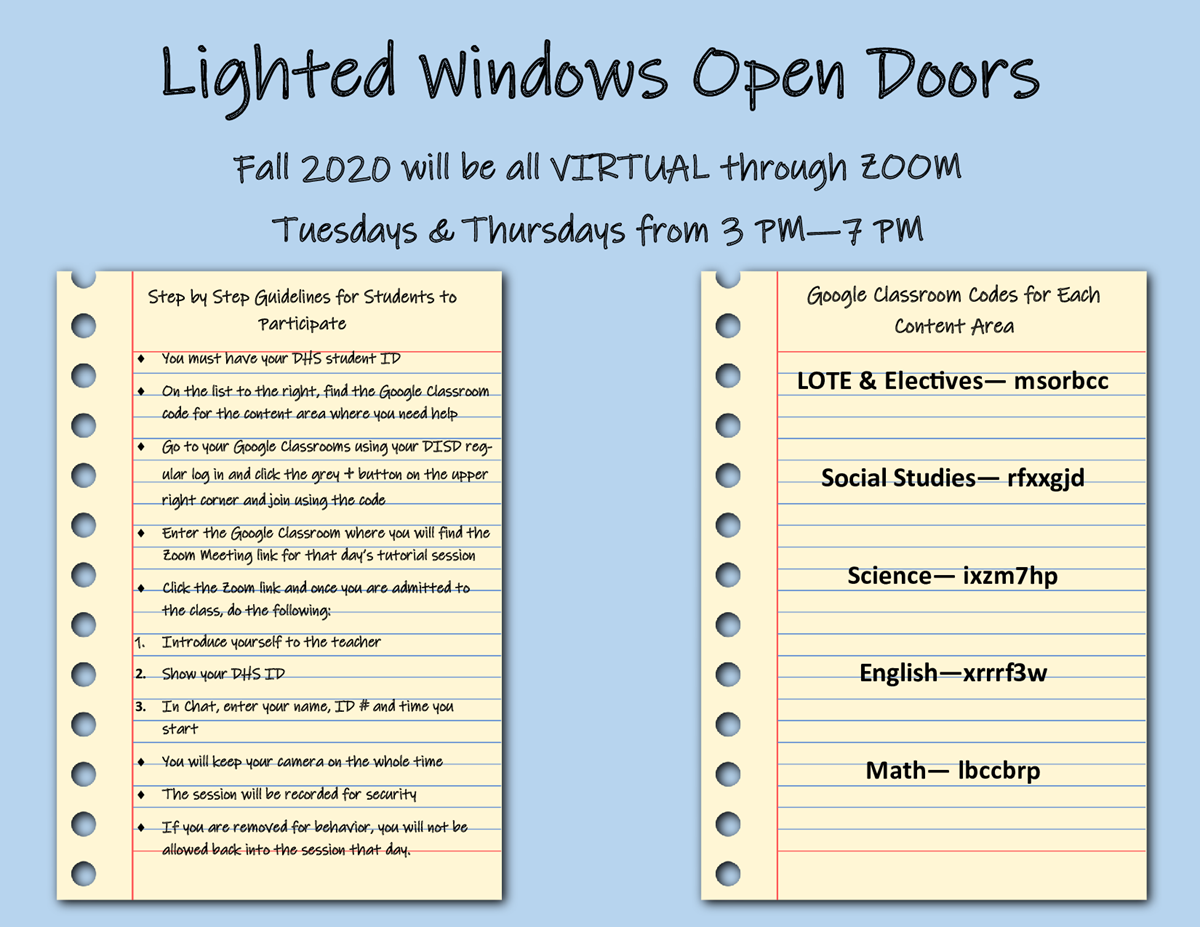 Also, make sure to check out Lighted Windows Open Doors in our Virtual Library this year. Every Tuesday and Thursday from 3-7 pm there will be teachers available to help with any tutorial needs.