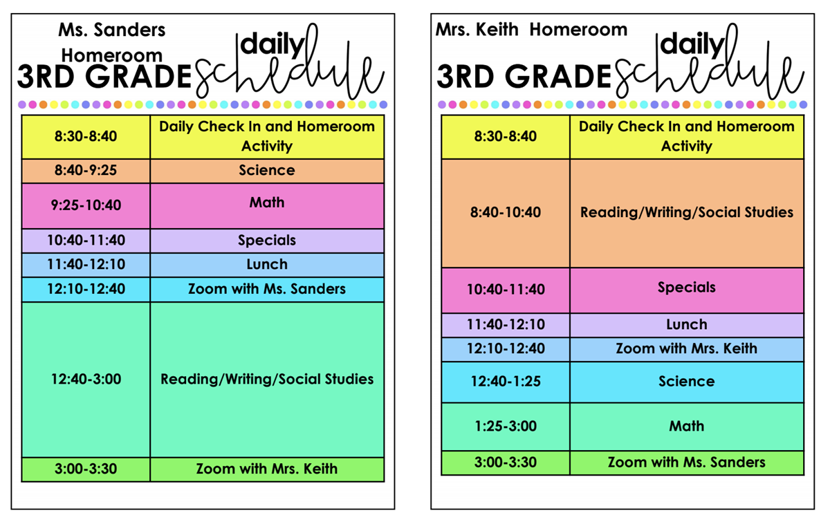 Here are the daily schedules for distance learning! Please make sure to follow the correct homeroom teacher's schedule. If you do not know who your child's homeroom teacher is, it is posted in skyward and in google classroom.